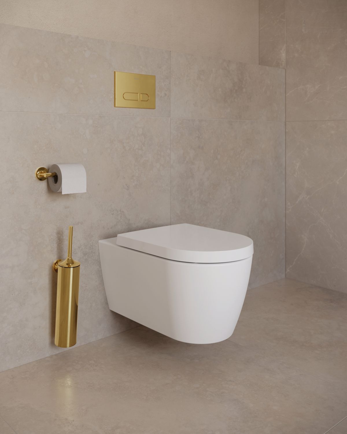 Małe zmiany, duży efekt: przycisk spłukujący, uchwyt na papier toaletowy oraz zestaw szczotki w wykończeniu polerowanego złota stanowią wyraziste, lecz subtelne akcenty, nadając strefie WC spokojny i elegancki charakter.
